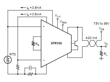 XTR105UA features: (1)low unadjusted error; (2)two precision current sources 800μA each; (3)RTD or bridge excitation; (4)linearization; (5)two or three-wire RTD operation; (6)low offset drift: 0.4μV/℃; (7)low output current noise: 30nAp-p; (8)high PSR: 110dB min; (9)high CMR: 86dB min; (10)wide supply range: 7.5V TO 36V; (11)14-PIN DIP and SO-14 SOIC packages.